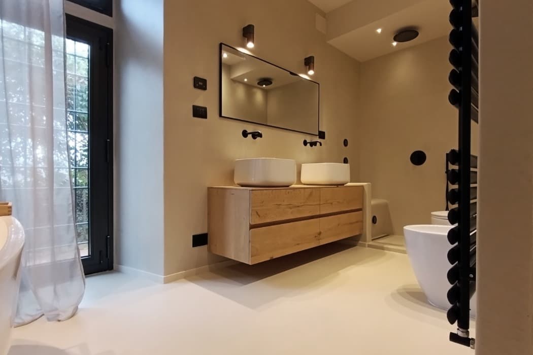 Minimalistický dekor povrchové úpravy nepůsobí prvoplánově, o to více je elegantní a nadčasový. Působivý matný povrch beze spár vytváří mimořádný vizuální a hmatový pocit. Díky tepelné vodivosti materiálu Biomalta Arteviva si majitelé užijí výhody podlahového vytápění. Protiskluzný povrch zajišťuje bezpečný pohyb v koupelně, snadná údržba je samozřejmostí.