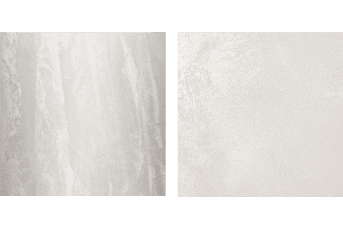 Pokud chceme získat minimalistické matné povrchy, můžeme použít Travertino Romano nebo Tiepolo Gessato, přírodní produkty s charakteristickým vzhledem vápenných materiálů. Vysoce tvárné materiály jsou snadno zpracovatelné a nabízejí řadu kreativních dekorů od struktur kamene po decentní minimalistické efekty.